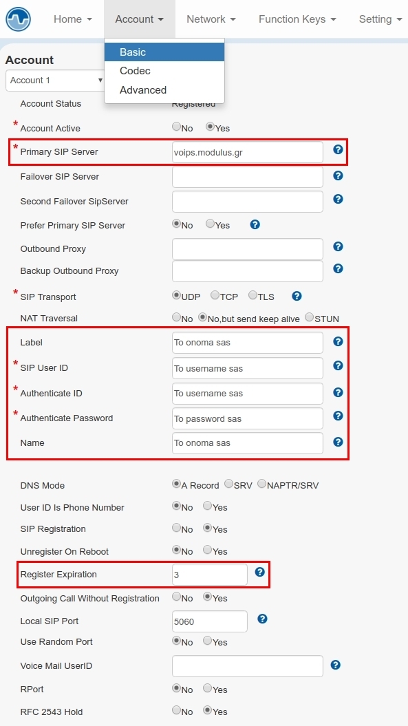 Στην οθόνη "Account > Basic", κάνουμε τις απαραίτητες αλλαγές όπως φαίνονται στην εικόνα. Εφόσον έχουμε εισάγει σωστά τα στοιχεία, στο πεδίο “Account Status” θα εμφανιστεί η ένδειξη “Registered”.