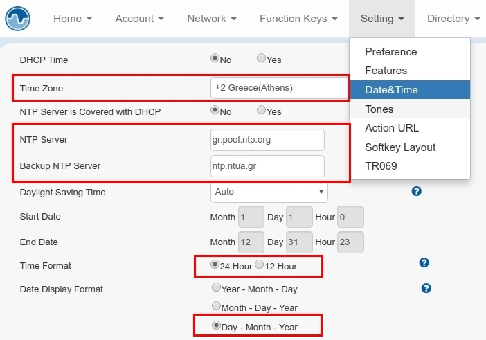 Στην καρτέλα "Settings > Date&Time", κάνουμε τις εξής αλλαγές: