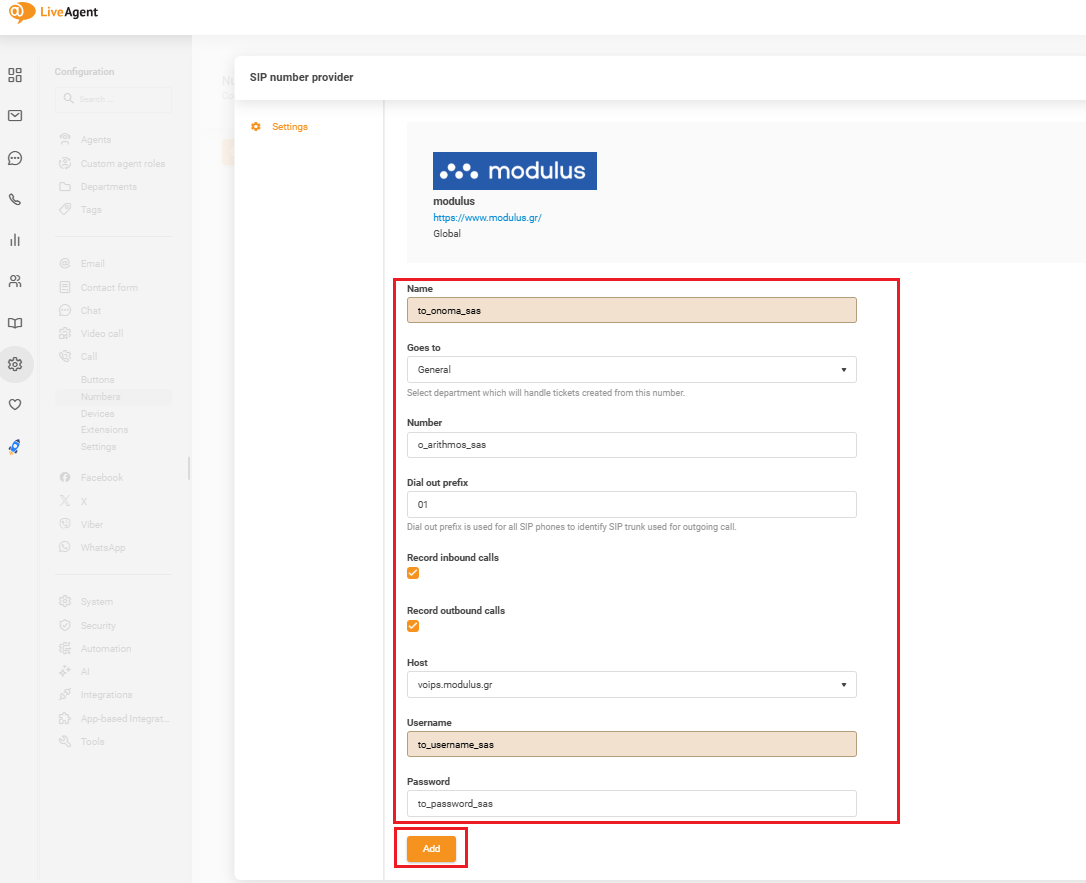 Σύνδεση του LiveAgent με modulus VoIP πάροχο