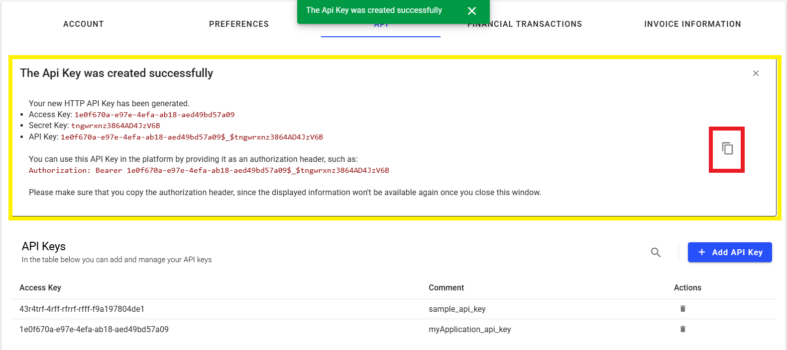 Σημαντική Σημείωση: Βεβαιωθείτε ότι έχετε αποθηκεύσει την πληροφορία σχετικά με τα κλειδιά που παρήχθησαν, ιδιαίτερα την τιμή του secret key. Με το κλείσιμο της σελίδας, η πληροφορία δε θα είναι διαθέσιμη ξανά. Σε περίπτωση που χαθεί, θα χρειαστεί να επαναλάβετε τα βήματα για την έκδοση νέων API & Secret keys. Αν αντιμετωπίσετε οποιοδήποτε ζήτημα με την εκδοση API κλειδιου mmp πλατφόρμας, μπορείτε να απευθυνθείτε στο Κέντρο βοήθειας της modulus.