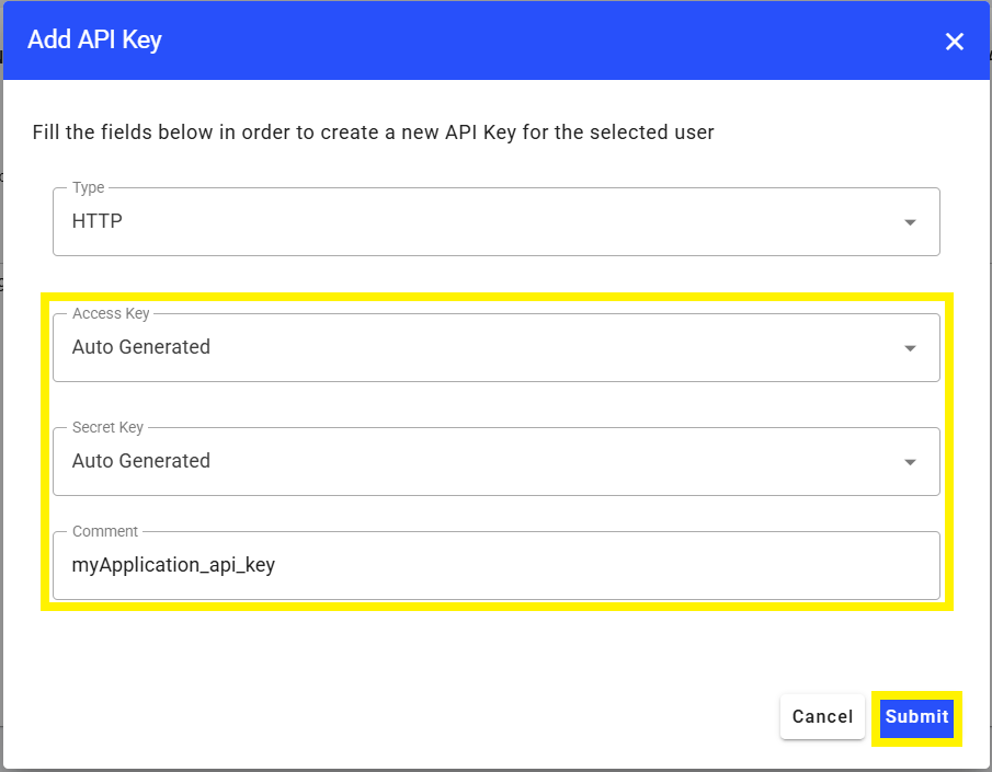 Η πλατφόρμα υποστηρίζει δύο είδη API διασύνδεσης: SMPP και HTTP. Για λόγους ευκολίας, ως παράδειγμα, παρουσιάζεται η περίπτωση δημιουργίας ενός HTTP API key. Αν επιθυμείτε να δημιουργηθεί αυτόματα από την πλατφόρμα το API key και το αντίστοιχο Secret key, απλά επιλέξτε το κουμπί “Submit”. Στο πεδίο με τα σχόλια, μπορείτε να συμπληρώσετε την πληροφορία “myApplication_api_key”.