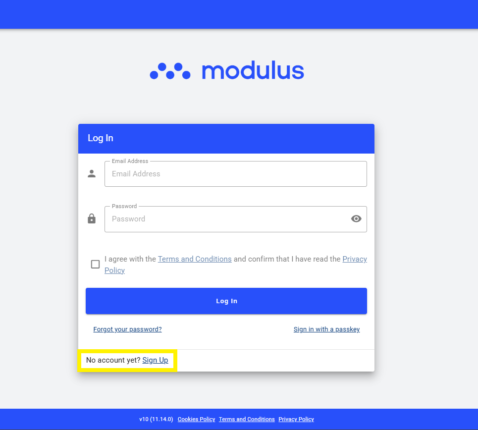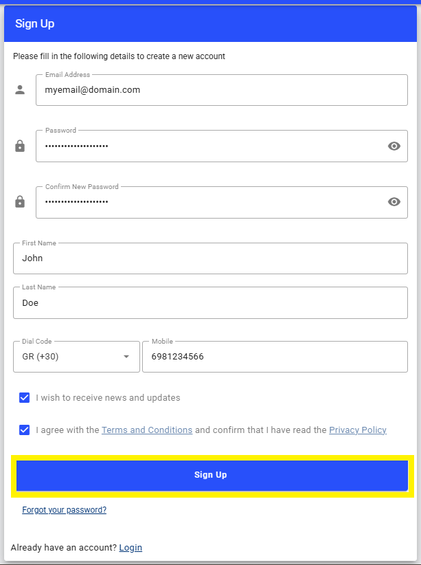 Επισκεφθείτε τη σελίδα του mMP για να δημιουργήσετε τον λογαριασμό σας. Κάντε κλικ στην επιλογή "Sign Up" στην αρχική οθόνη, όπως φαίνεται παρακάτω. Θα μεταφερθείτε αυτόματα στη φόρμα εγγραφής.