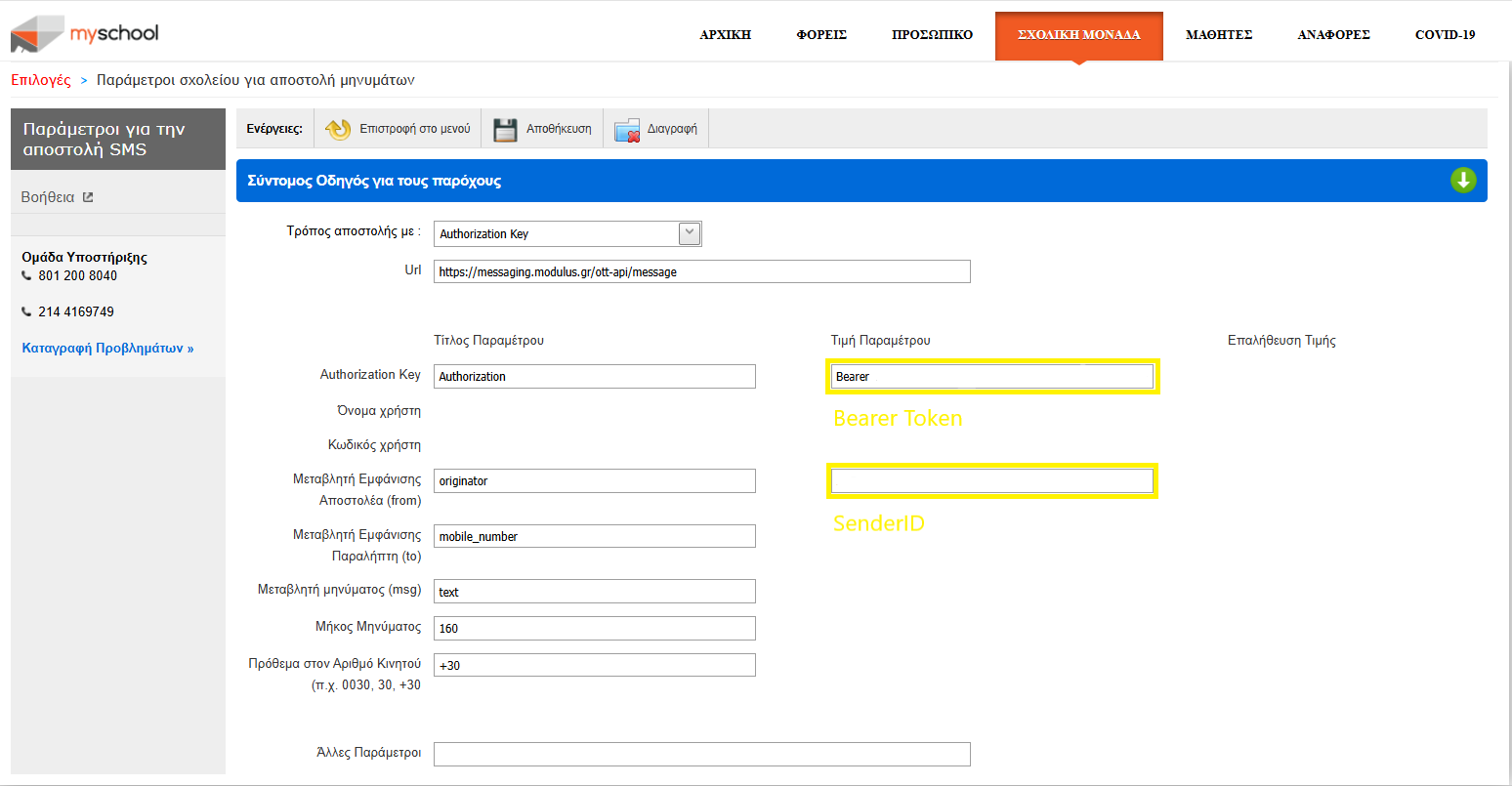 Σε αυτό το άρθρο θα βρείτε οδηγίες για τη ρύθμιση της πλατφόρμας myschool ώστε να υποστηρίζει την αποστολή SMS μέσω της υπηρεσίας modulus Messaging Platform.