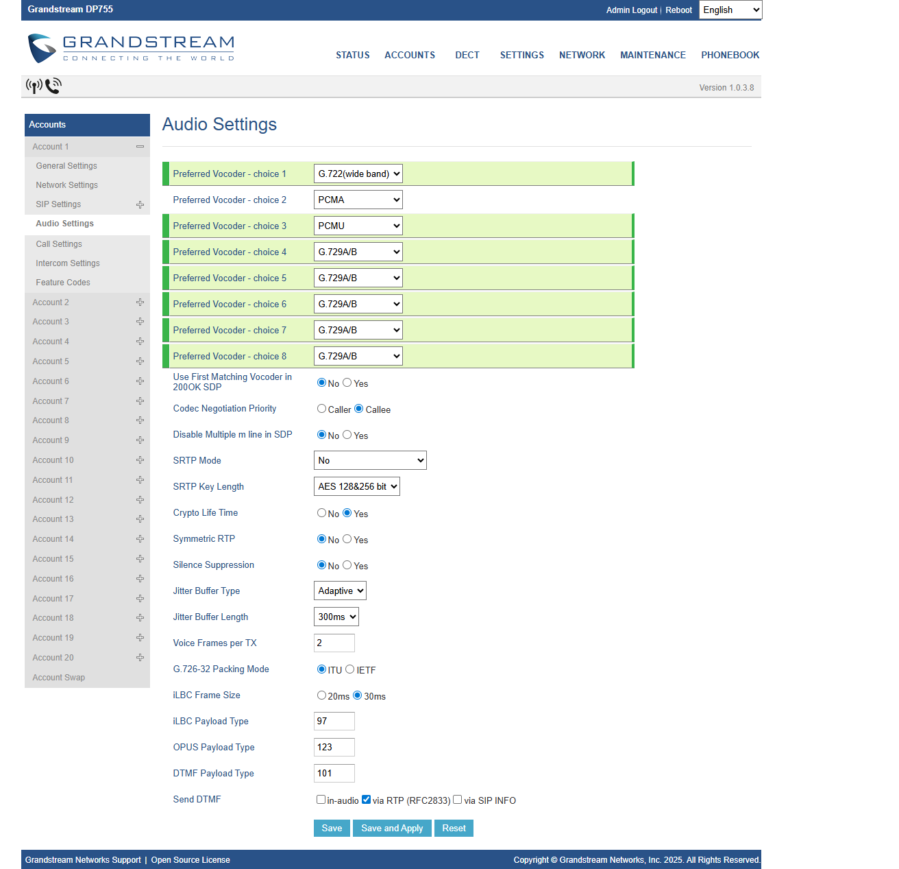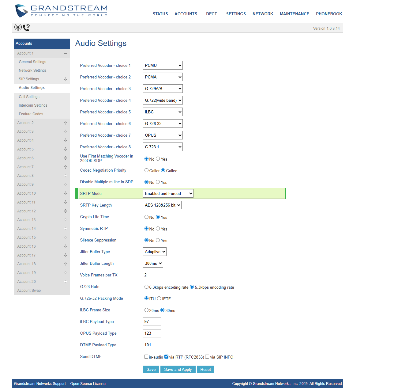 Στην καρτέλα Accounts > Account 1 > Audio Settings συμπληρώνετε: