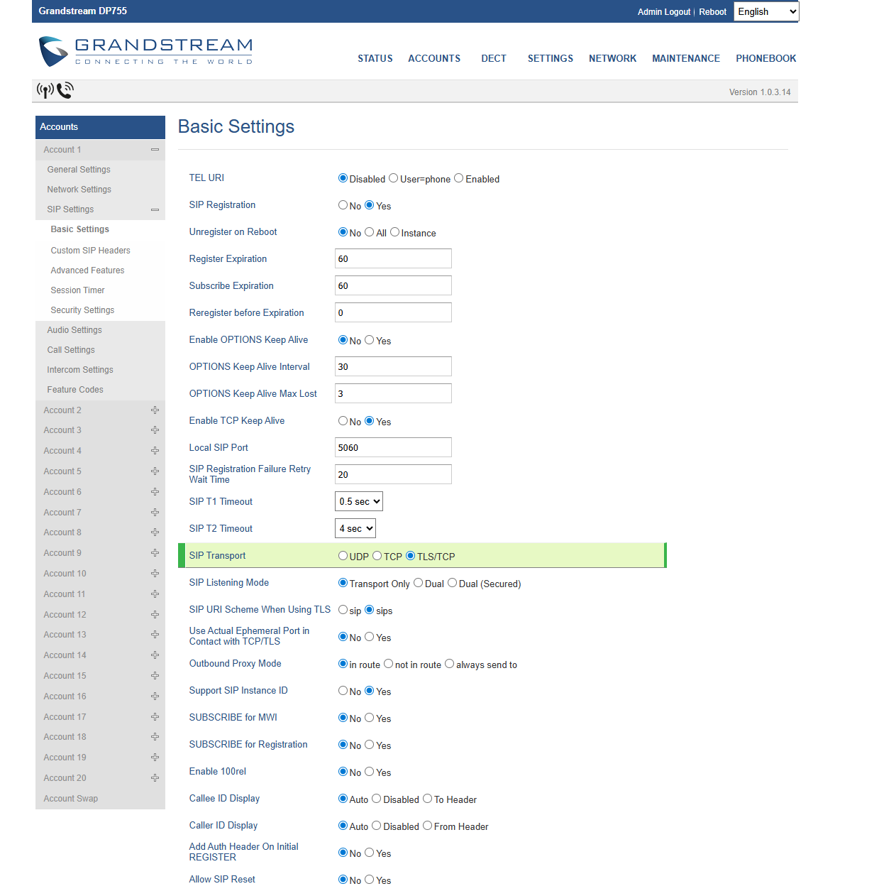 Στην καρτέλα Account > SIP Settings > Basic Settings συμπληρώνετε: