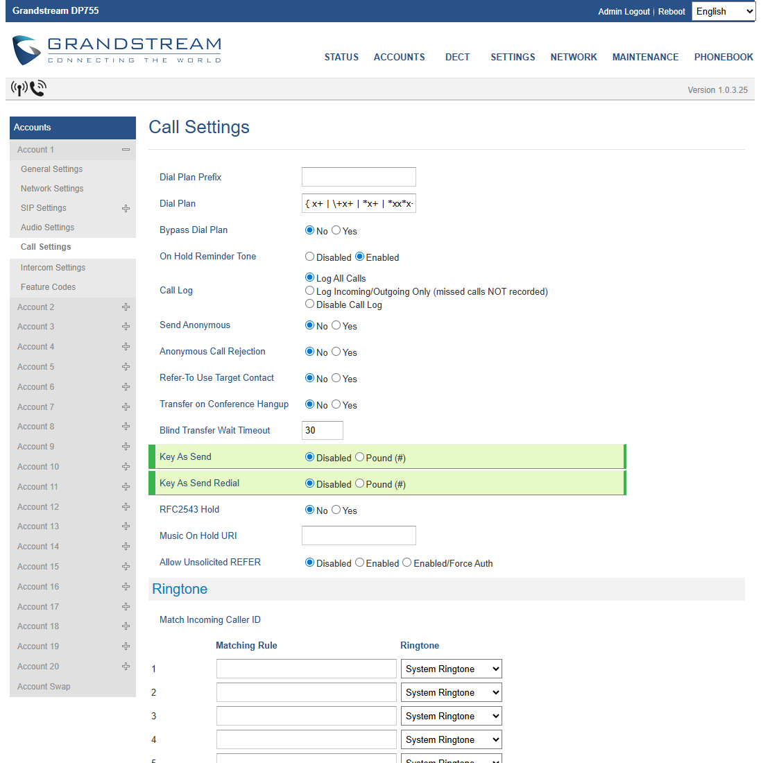 - Key as Send Redial: Disabled