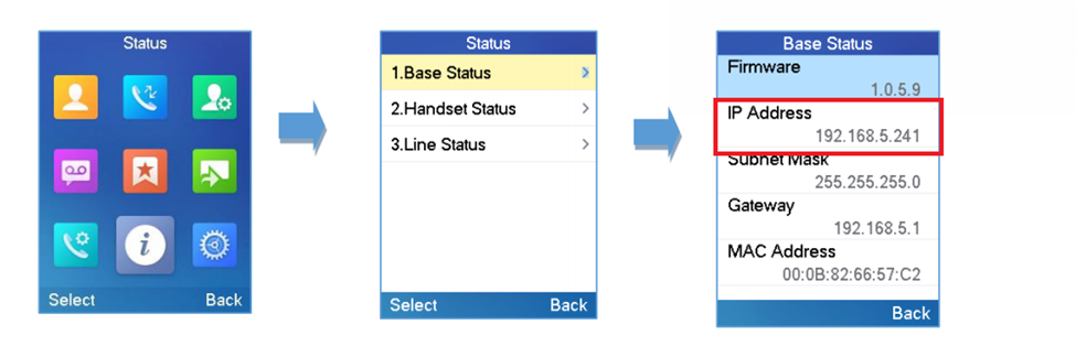 Για να βρείτε την IP της βάσης DP755, από το ακουστικό επιλέξτε Menu → Status → Base Status και σημειώστε την IP Address.