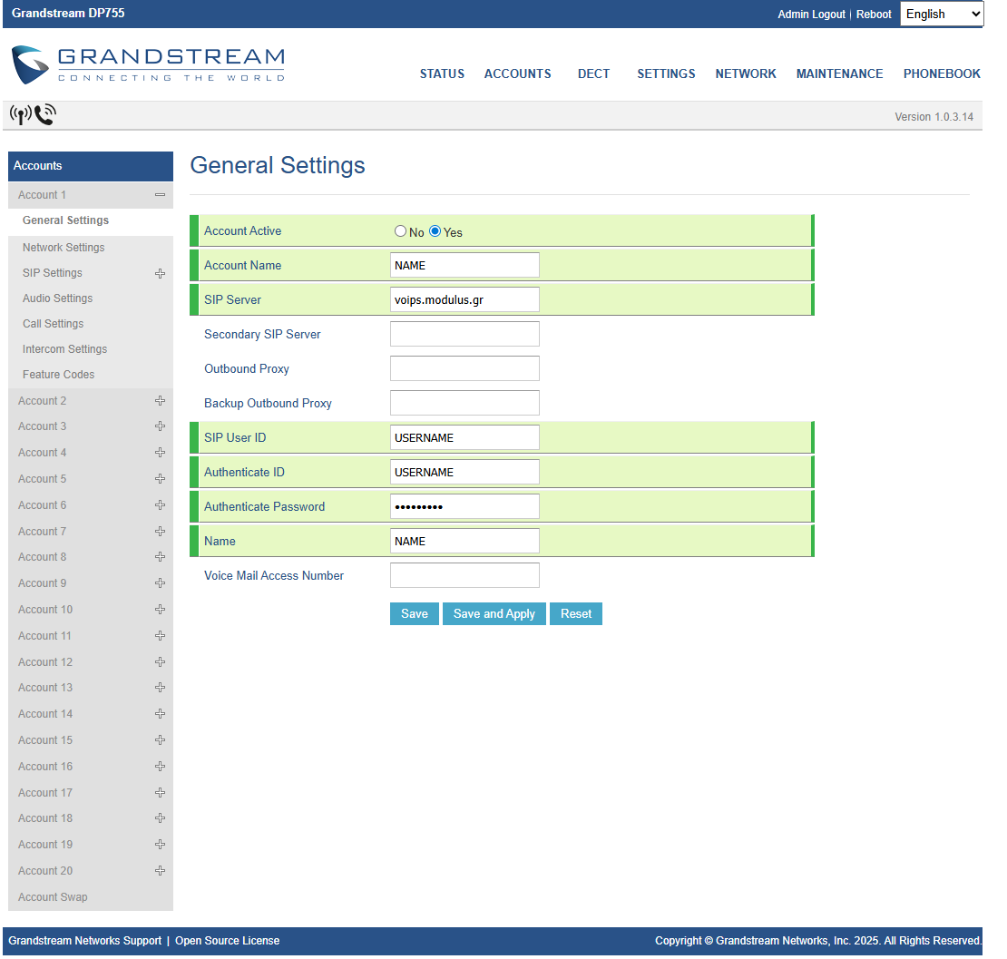 Στην καρτέλα Account > Account 1 > SIP Settings > Basic Settings συμπληρώνετε: