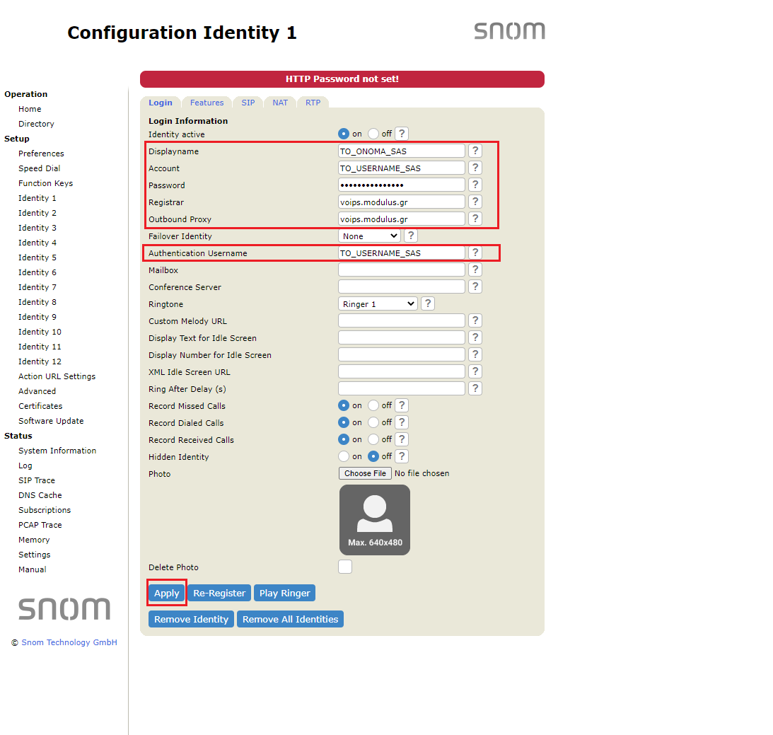 Θα εμφανιστεί το διαχειριστικό περιβάλλον της συσκευής. Επιλέγουμε “Identity 1” και στην καρτέλα “Login” εισάγουμε τις απαραίτητες πληροφορίες σύμφωνα με την παρακάτω εικόνα: