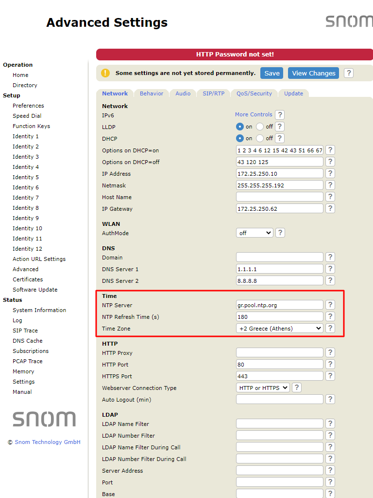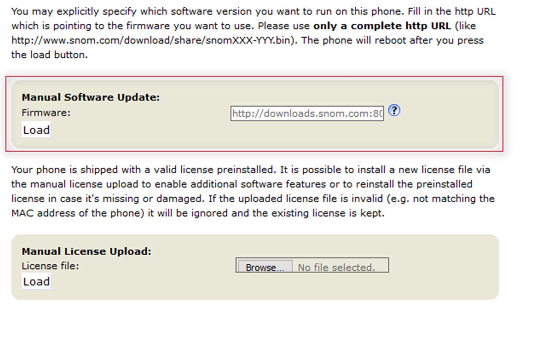 Μεταβαίνουμε στην ιστοσελίδα της Snom και εντοπίζουμε το τελευταίο firmware για την συσκευή μας. Αναζητούμε το μοντέλο της συσκευής μας στο κάτω μέρος της σελίδας κάτω από την κατηγορία "Downloads / Firmware Files", επιλέγουμε το κατάλληλο αρχείο με δεξί κλικ και πατάμε "Copy Link Location". Στη συνέχεια, από το μενού της συσκευής, επιλέγουμε την ενότητα "Software Update" και στο σημείο "Manual Software Update" εισάγουμε τον σύνδεσμο και πατάμε το πλήκτρο "Load".