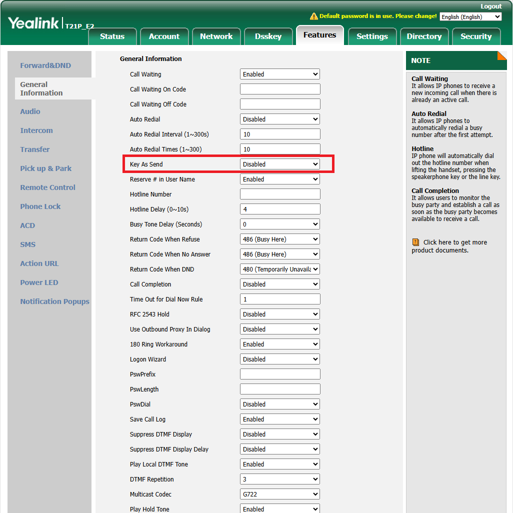 - Στην καρτέλα Features > General Information > Key As Send επιλέξτε Disabled και αποθηκεύστε.